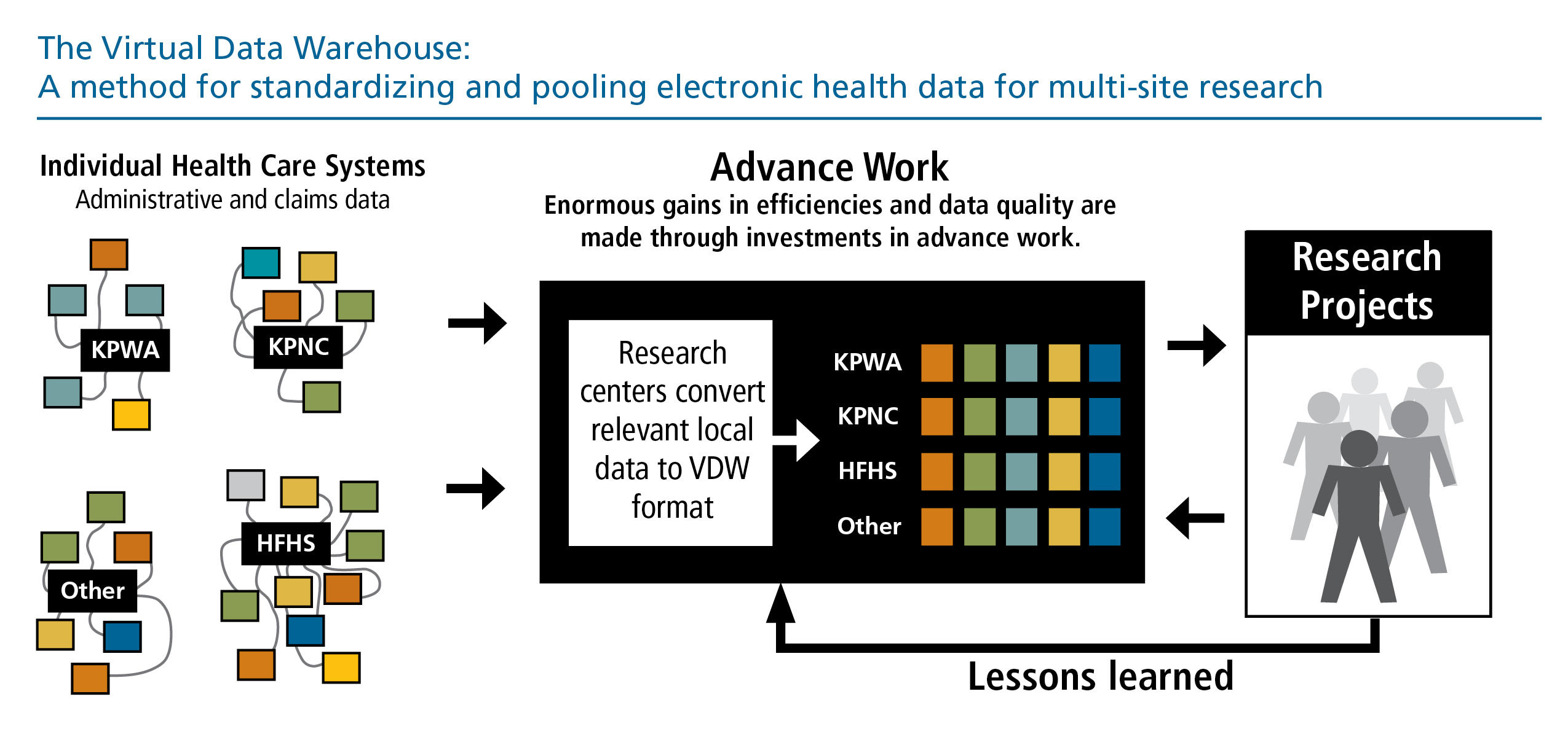 The VDW is an example of a distributed (or federated) data-sharing model based on EMR, claims, and administrative health care data. It is applicable for multi-site health services and population health research and can also support pragmatic and traditional clinical trials. With planning and ongoing funding, it yields data across institutions and over time.